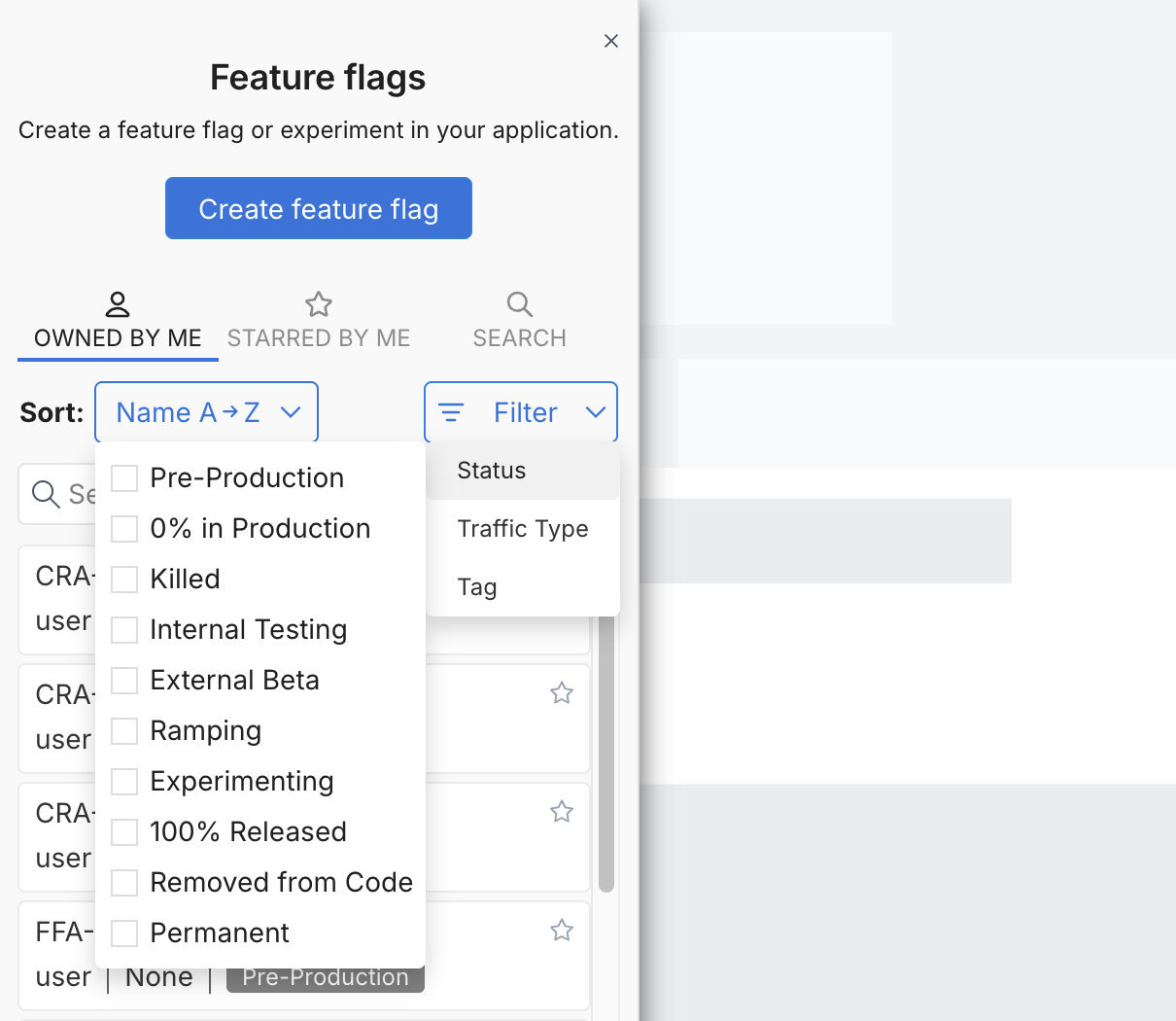 You can assign a status to each feature flag when creating or updating targeting rules. Statuses provide a way for teams to indicate which stage of a release or rollout a feature is in at any given moment, and as a way for teammates to filter their feature flags to see only the ones that are in a particular stage of the internal release process.